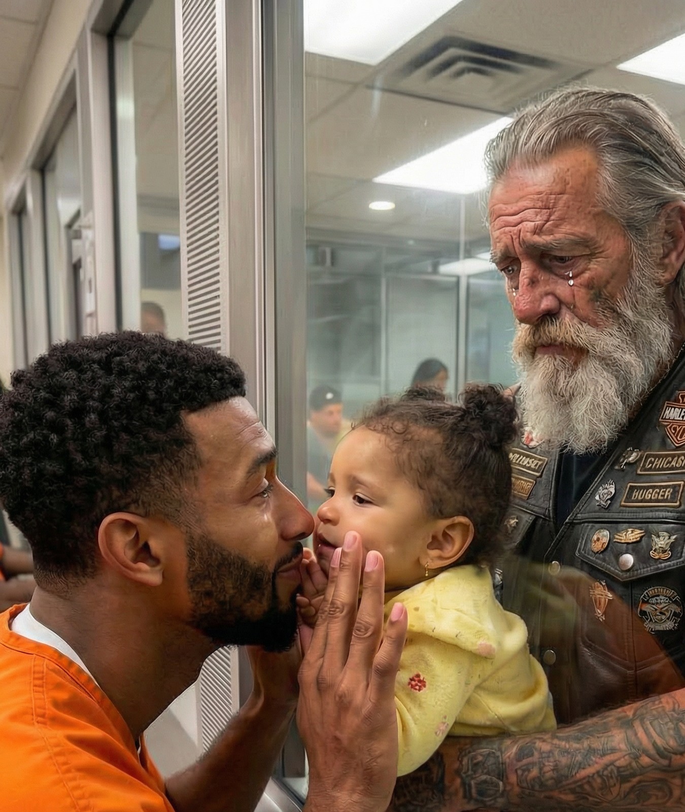 When Marcus walked into the visitation room, he didn’t find his attorney. He found an older man in a worn leather vest, long gray beard, and gentle eyes—holding a tiny baby bundled in a pastel blanket.