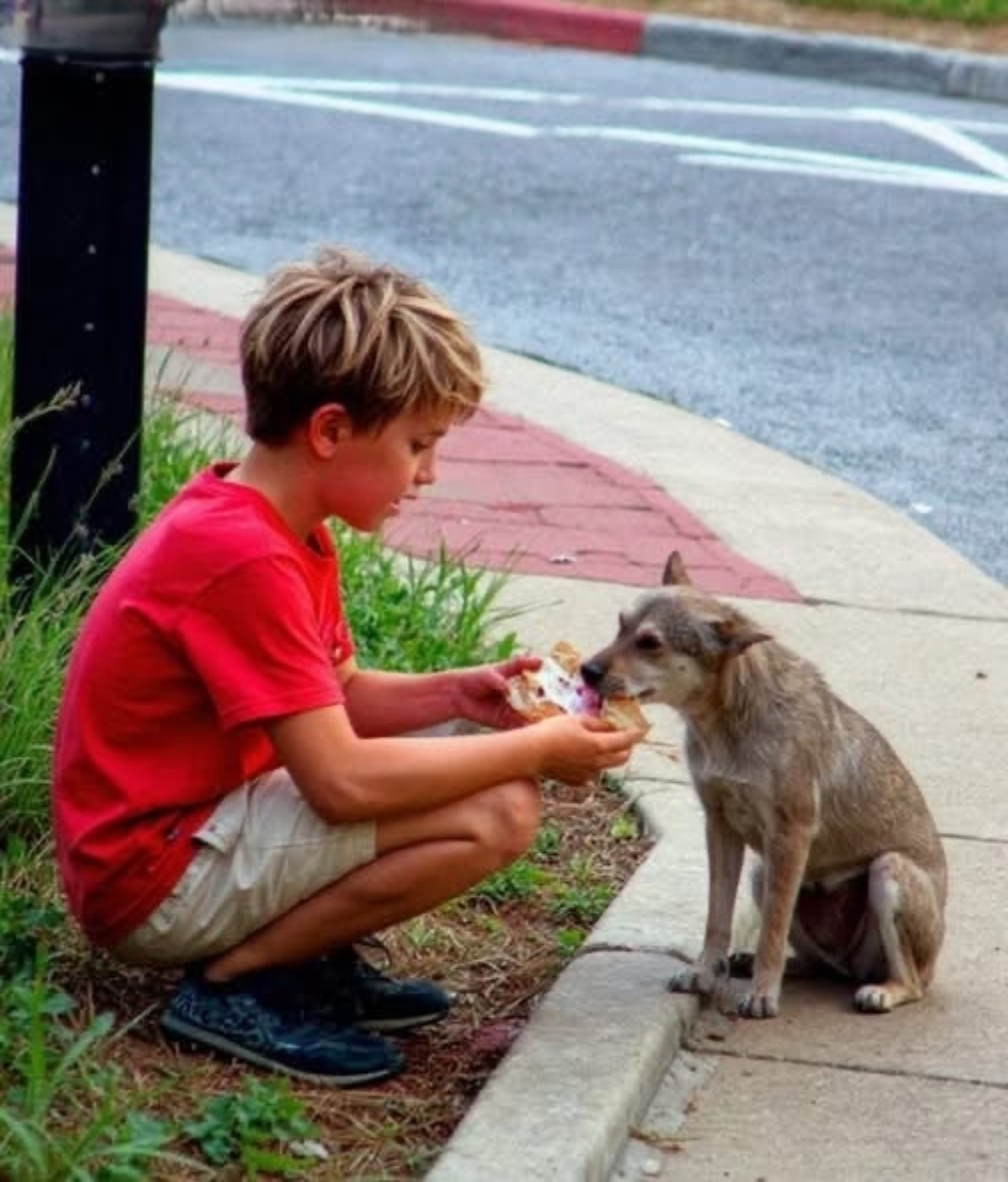 He knelt beside a leaning fence, pulled out his sandwich, and tore it in half. The second half he set near a rusted dumpster — and out crawled the saddest, skinniest stray dog I’d ever seen. Matted fur, ribs showing, but the moment it saw Theo, its tail wagged like pure hope.