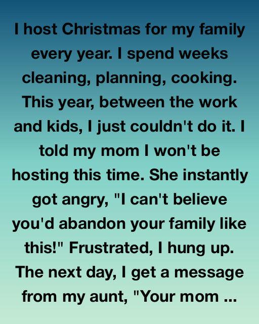 So, I called my mom. Calmly, I told her I couldn’t host this year. She didn’t hesitate. “I can’t believe you’d abandon your family like this!” she snapped. Her words stung, but not because they were new — because they weren’t. I’d spent years being treated like the family’s default event planner instead of a daughter. I hung up before I said something I’d regret.
