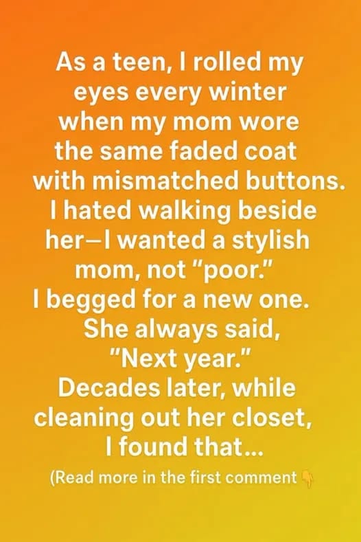 When I was a teenager, I used to cringe every winter when my mom brought out her old, faded coat. It was a dull brown thing with mismatched buttons, frayed edges, and a worn collar that had seen far better days. I hated walking next to her in it. I wanted her to look stylish, not like someone who couldn’t afford better. I remember begging her every year, “Mom, please, just buy a new one.” She’d smile softly and say, “Next year, honey. Maybe next year.” I thought she was just being stubborn, maybe even careless. I never understood.