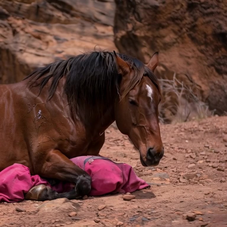 The stallion was injured, his shoulder bloodied, but he wasn’t helpless. His massive body curved protectively over something hidden beneath him. When the rescuers moved closer, he pinned his ears and refused to move. It wasn’t until he shifted, with great effort, that the truth was revealed. Beneath the horse lay a human infant—wrapped in a pink blanket, weak but alive.